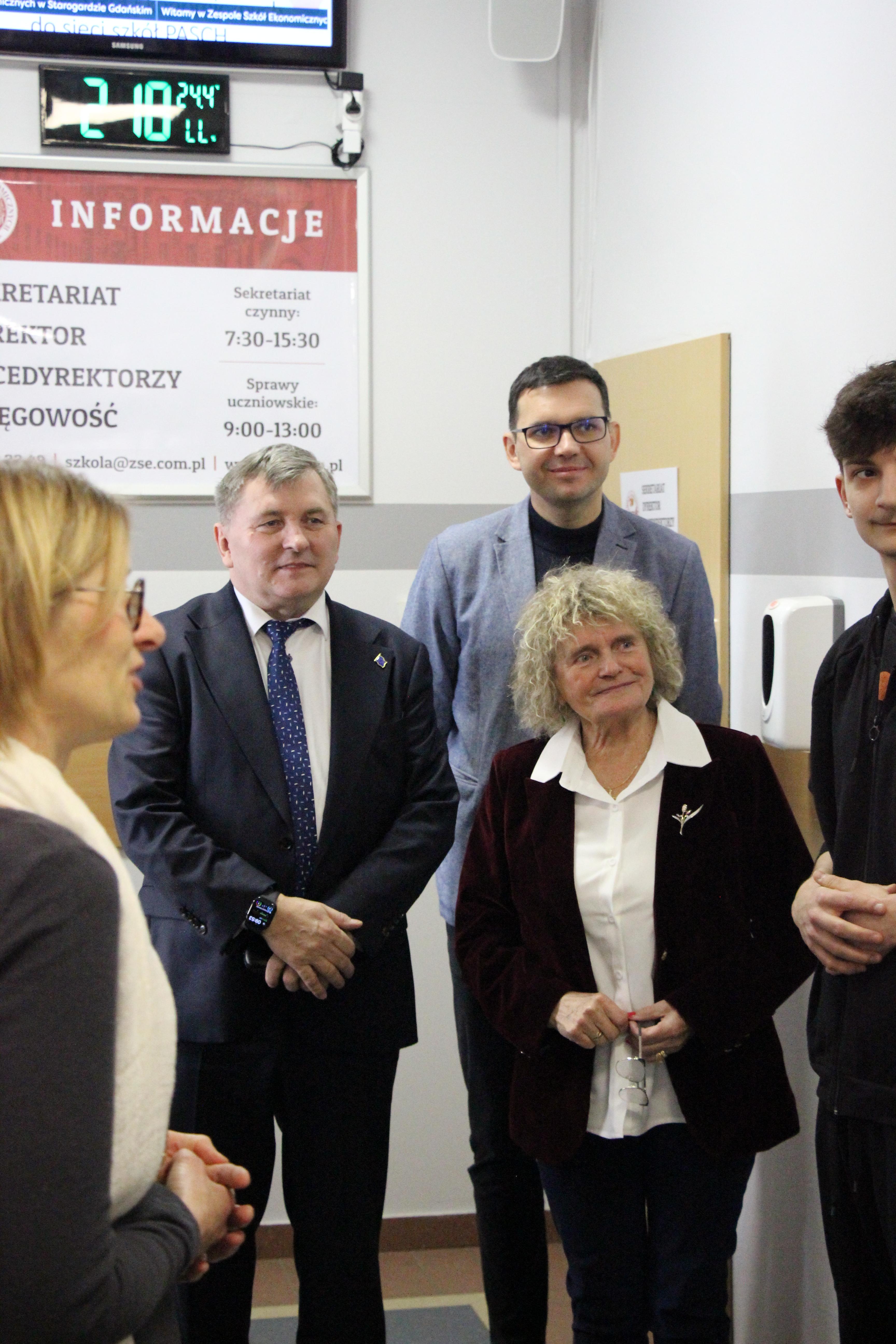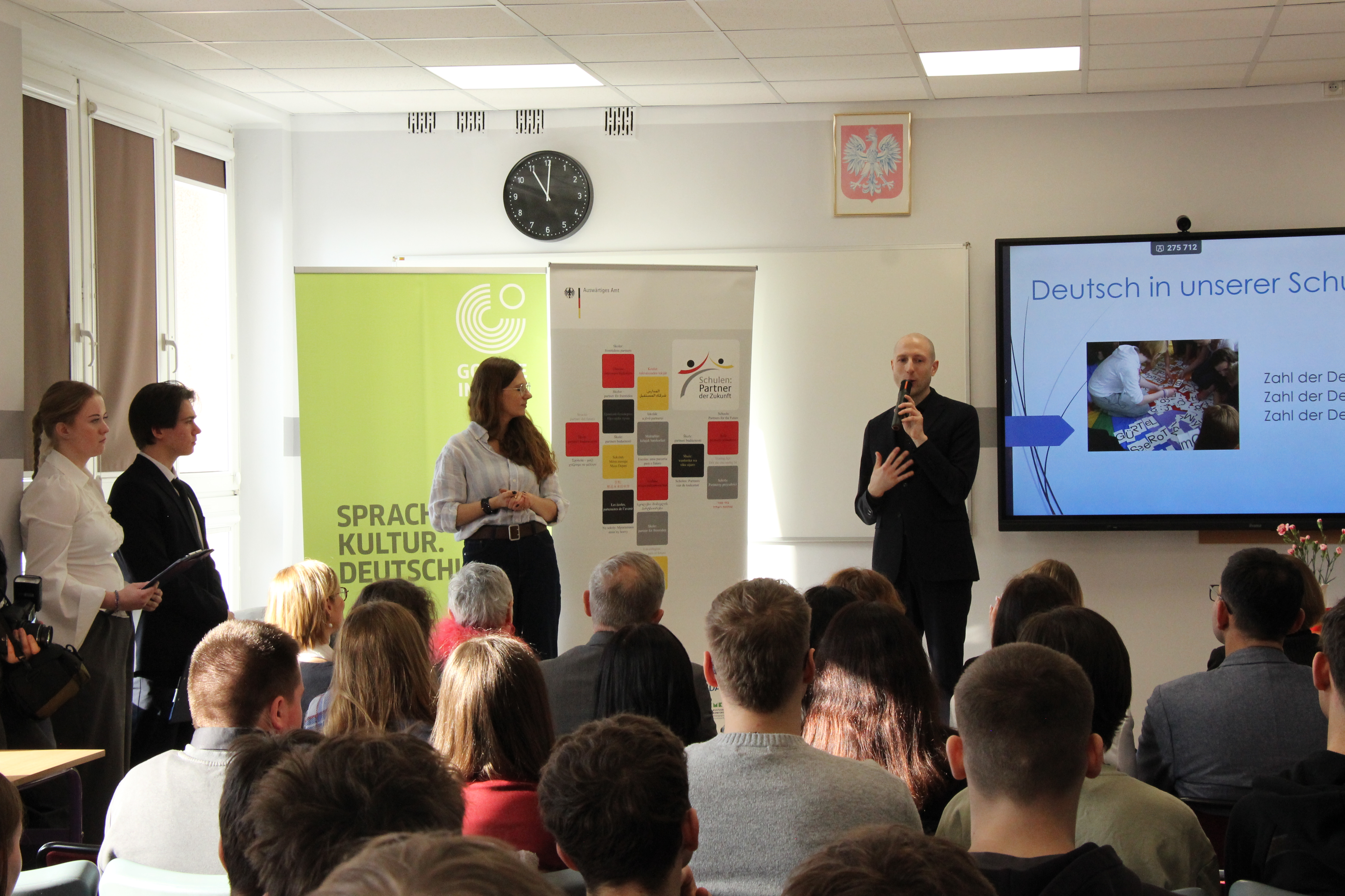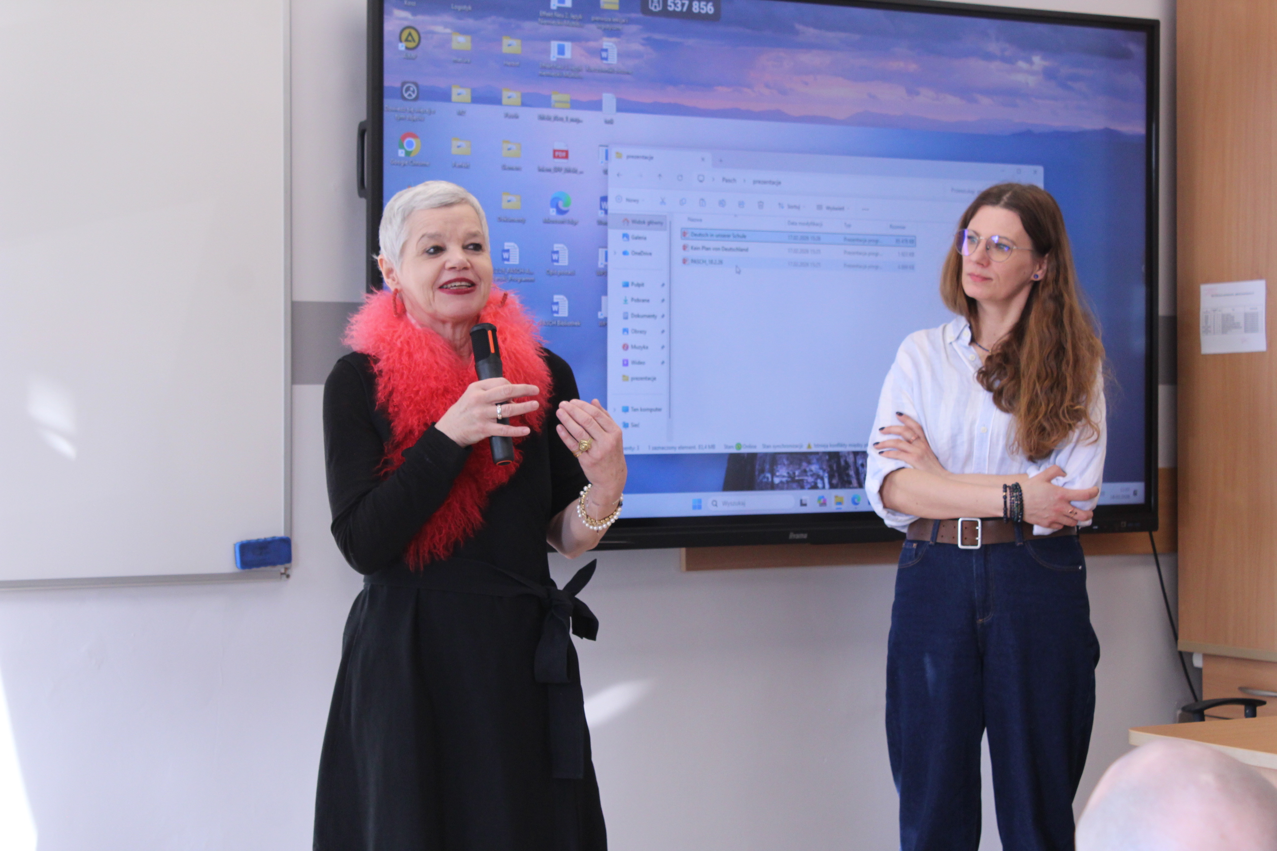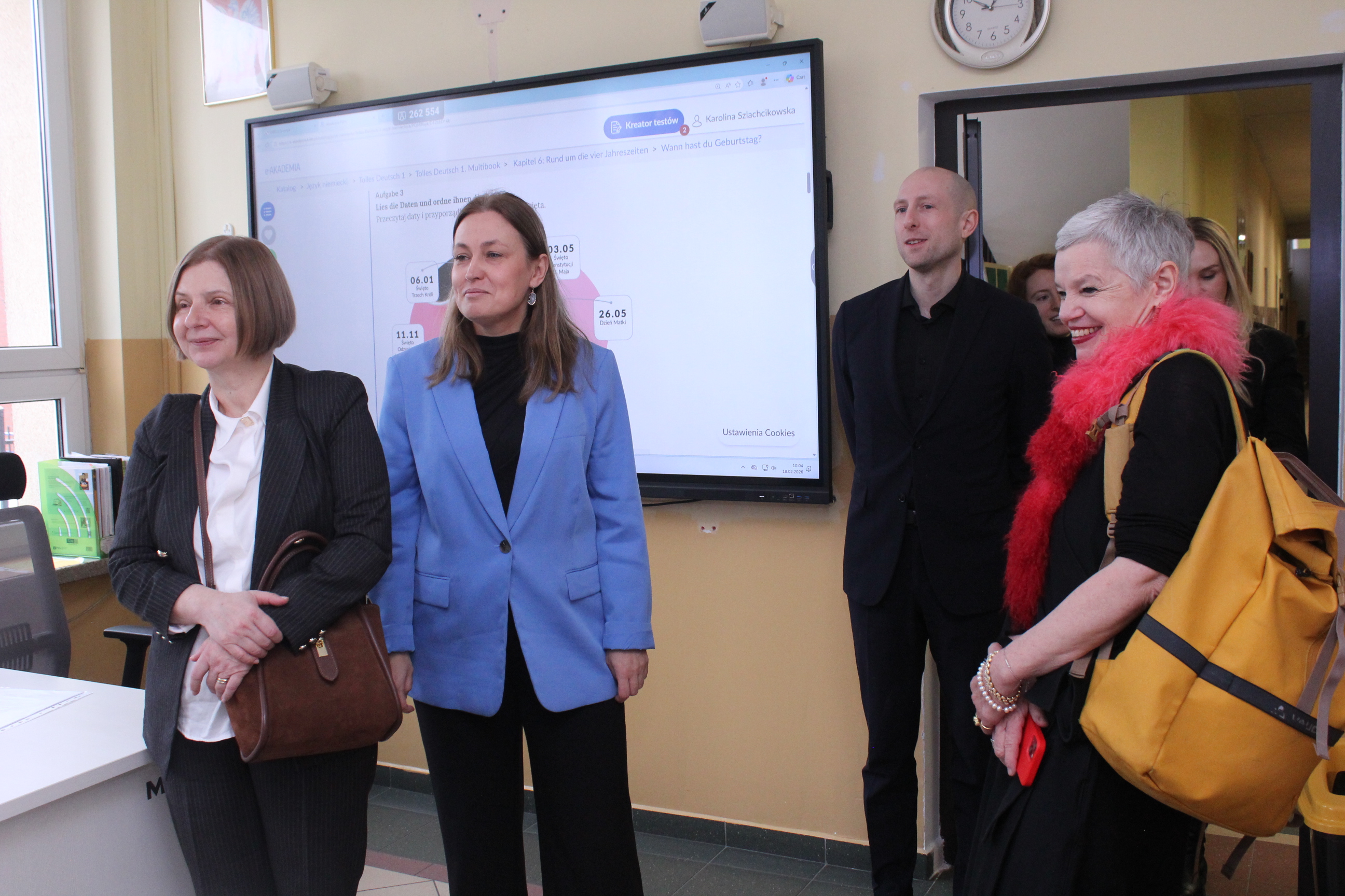 Uroczystość przyłączenia do sieci PASCH, która odbyła się 18 lutego 2026 roku, miała niezwykle podniosły charakter. Zaszczycili nas swoją obecnością przedstawiciele kluczowych instytucji partnerskich. Ambasadę Niemiec w Warszawie reprezentowali Thorsten Kerp, Magdalena Urban-Tomaševič oraz Anouk Kubenz. Z Instytutu Goethego przyjechały Anja Geissel, dyrektorka działu językowego, oraz Bodil Jessen-Klingenberg i Monika Bartyska, odpowiedzialne za inicjatywę PASCH. Firmę Siemens reprezentowała Dorota Różańska, natomiast Starostwo Powiatowe – wicestarosta Witold Sykutera, naczelniczka Wydziału Edukacji Małgorzata Stangel oraz etatowy członek Zarządu Powiatu Lucyna Herold.