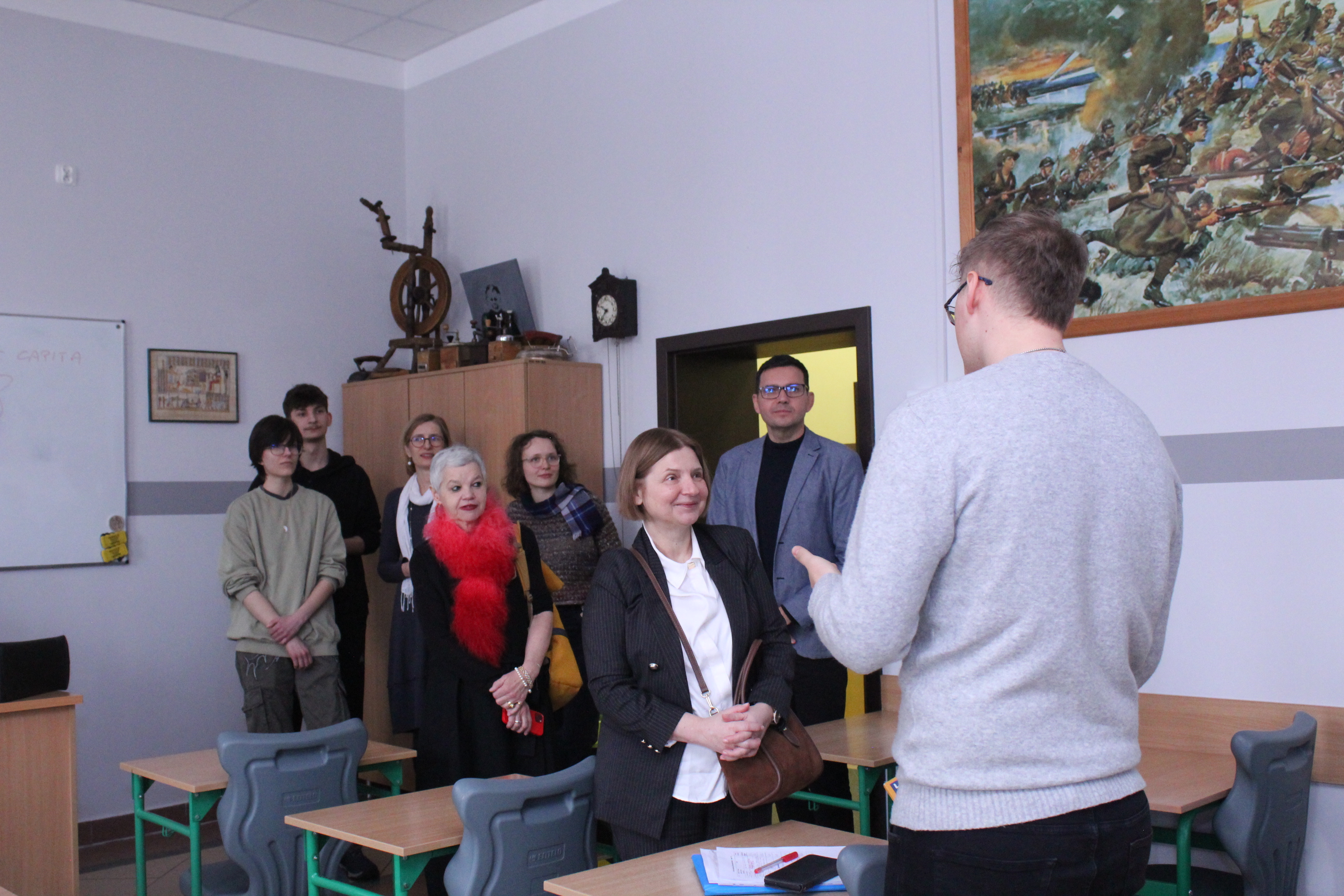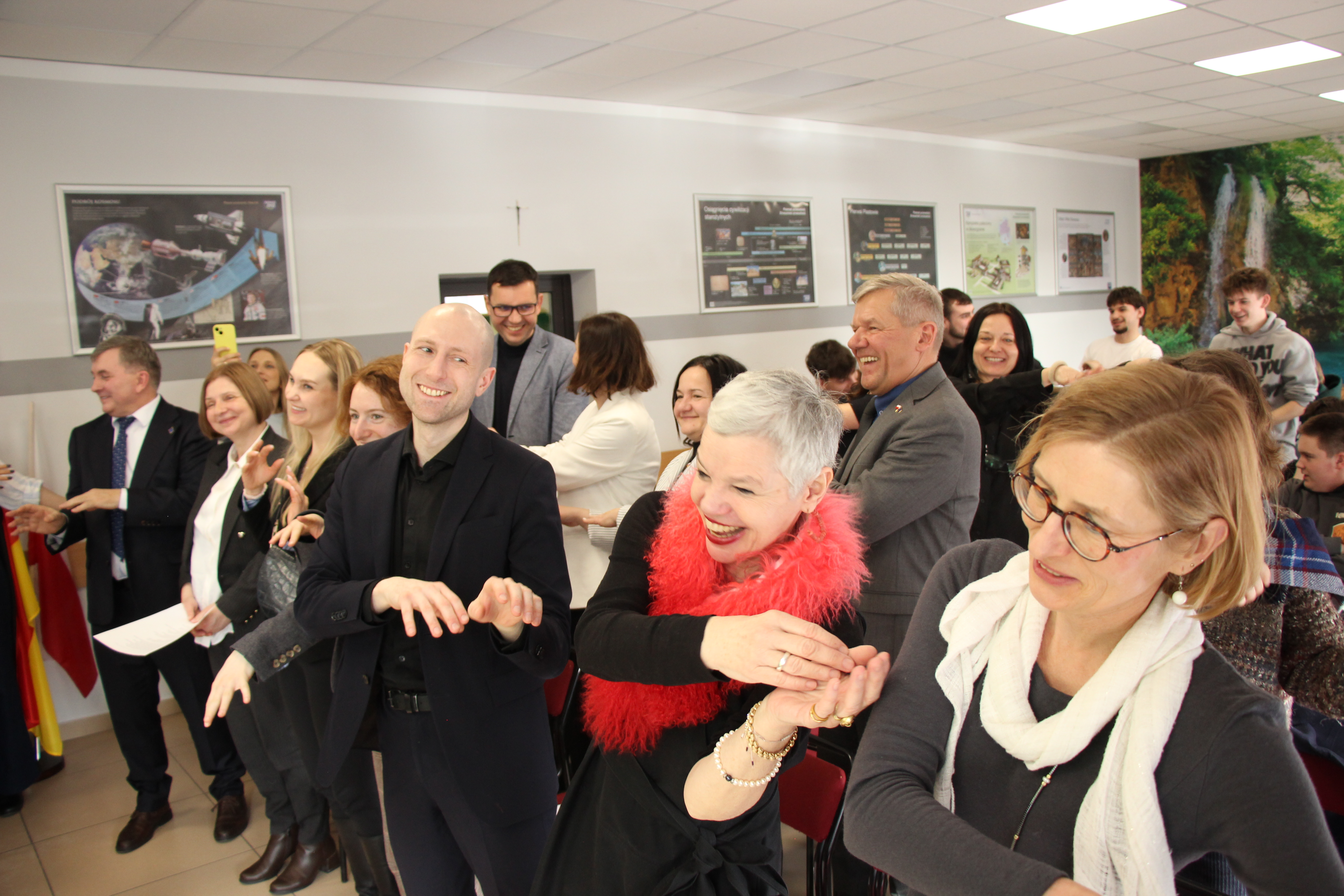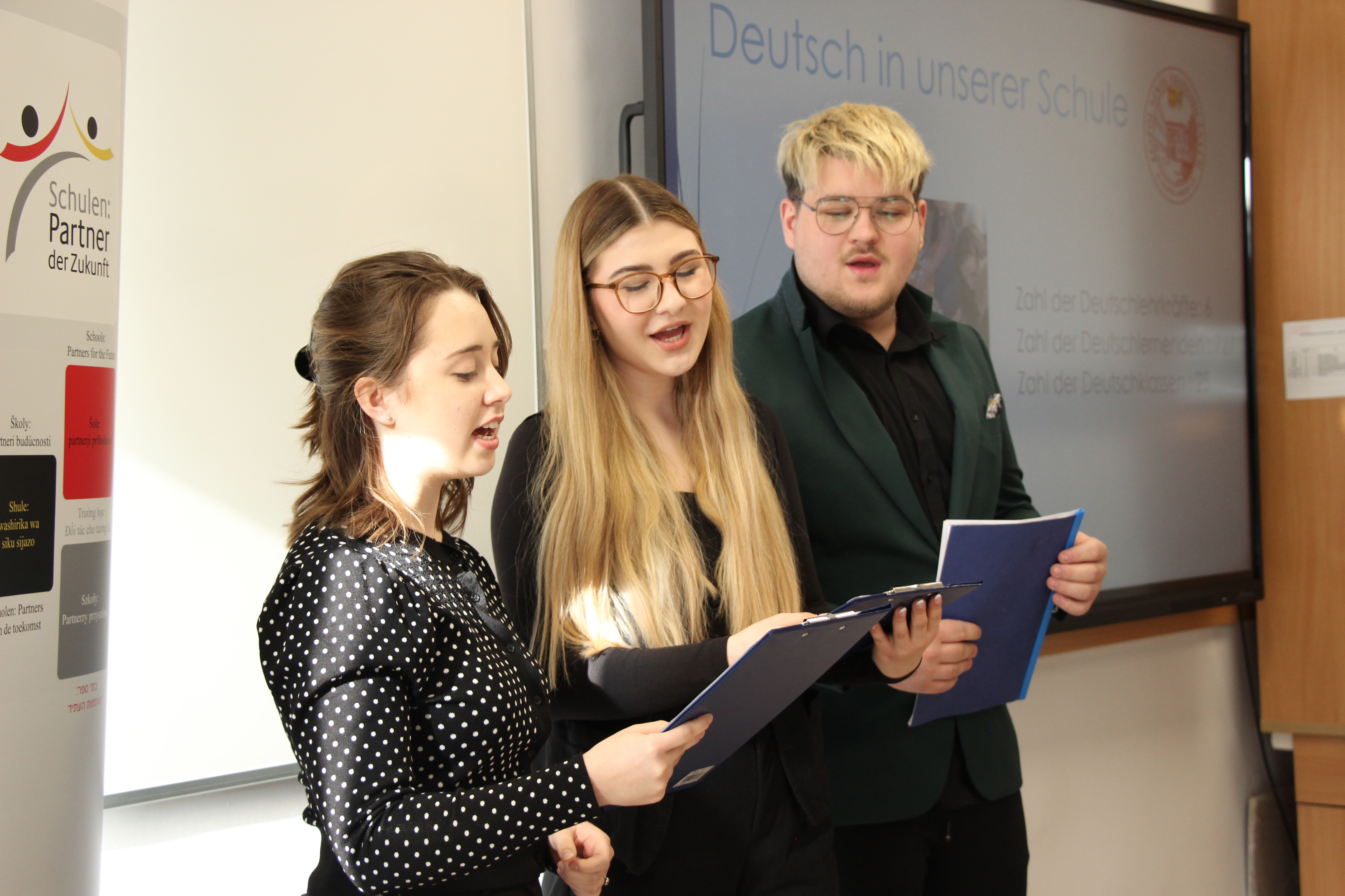 Uroczystość przyłączenia do sieci PASCH, która odbyła się 18 lutego 2026 roku, miała niezwykle podniosły charakter. Zaszczycili nas swoją obecnością przedstawiciele kluczowych instytucji partnerskich. Ambasadę Niemiec w Warszawie reprezentowali Thorsten Kerp, Magdalena Urban-Tomaševič oraz Anouk Kubenz. Z Instytutu Goethego przyjechały Anja Geissel, dyrektorka działu językowego, oraz Bodil Jessen-Klingenberg i Monika Bartyska, odpowiedzialne za inicjatywę PASCH. Firmę Siemens reprezentowała Dorota Różańska, natomiast Starostwo Powiatowe – wicestarosta Witold Sykutera, naczelniczka Wydziału Edukacji Małgorzata Stangel oraz etatowy członek Zarządu Powiatu Lucyna Herold.