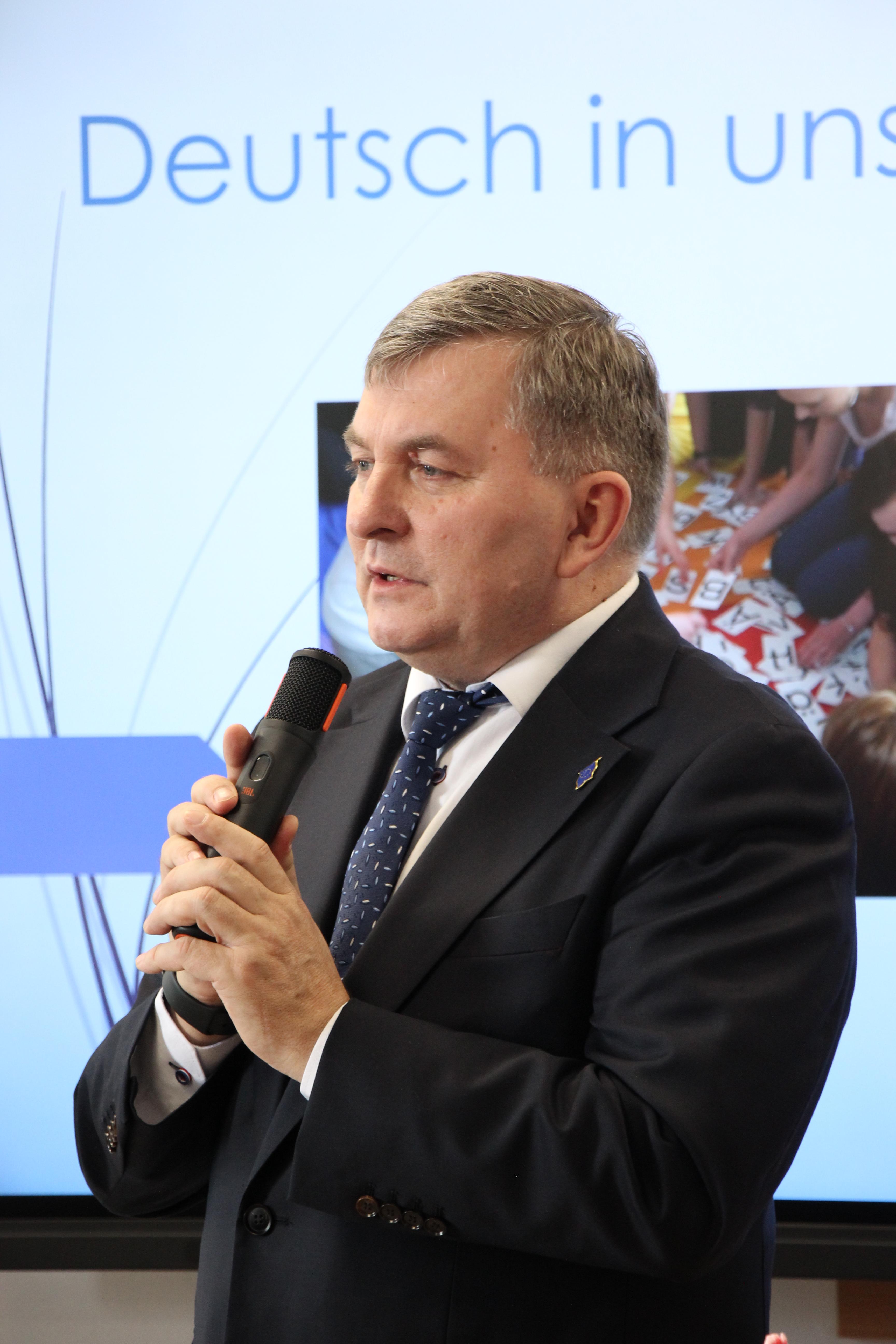 W dalszej części uroczystości głos zabrali zaproszeni goście. W imieniu Ambasady Niemiec wystąpił Thorsten Kerp, drugi attaché ds. kultury, akcentując rolę edukacji językowej w budowaniu trwałych relacji między Polską a Niemcami. Zwracając się do uczniów, podkreślił, że są przyszłością Europy i powinni pielęgnować w sobie ciekawość świata oraz otwartość na drugiego człowieka i inne kultury. Podstawą takiej postawy może być właśnie nauka języków obcych.