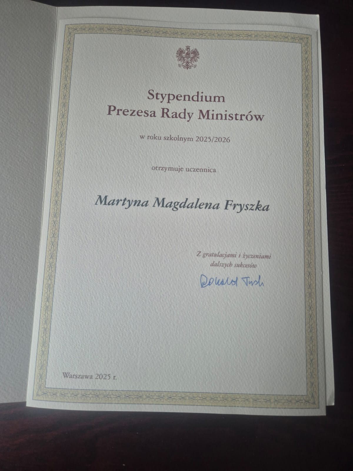 Niezmiernie miło nam ogłosić , że Martyna Fryszka z klasy V Ta otrzymała stypendium Prezesa Rady Ministrów w roku szkolnym 2025/2026.