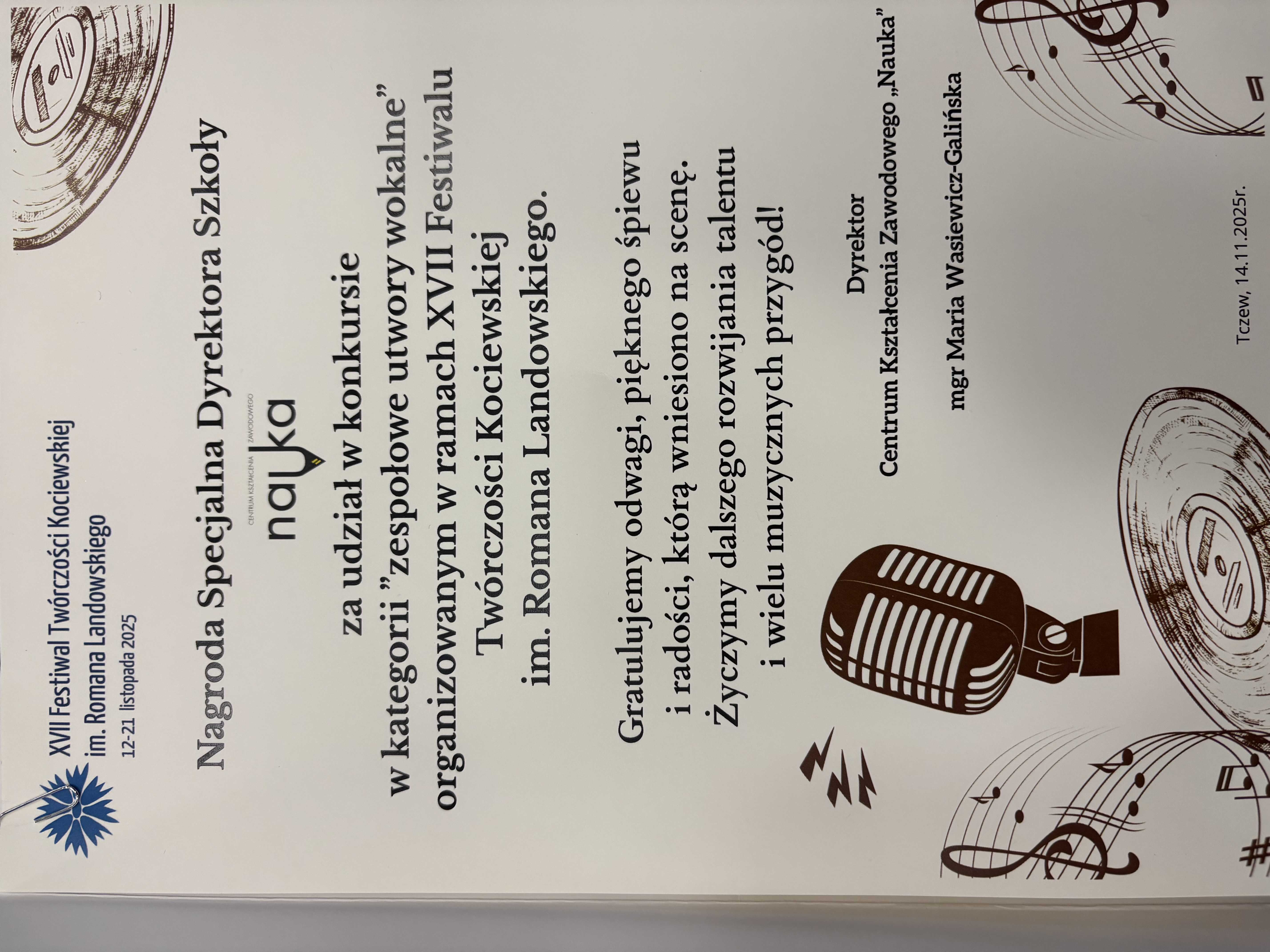 14 listopada 2025 Alona Harkavchenko i Maria Gumuła z klasy 4TR oraz Oliwer Gilla z klasy 1 TL brali udział w XVII Festiwalu Twórczości Kociewskiej im. Romana Landowskiego w Tczewie. W kategorii poezja śpiewana - utwory zespołowe zajęli I miejsce za muzyczną interpretację wiersza Romana Landowskiego „Samotność” w autorskiej kompozycji melodycznej, otrzymując Nagrodę Marszałka Województwa Pomorskiego oraz Nagrodę Specjalną Dyrektora Szkoły CKZ „Nauka” w Tczewie.
