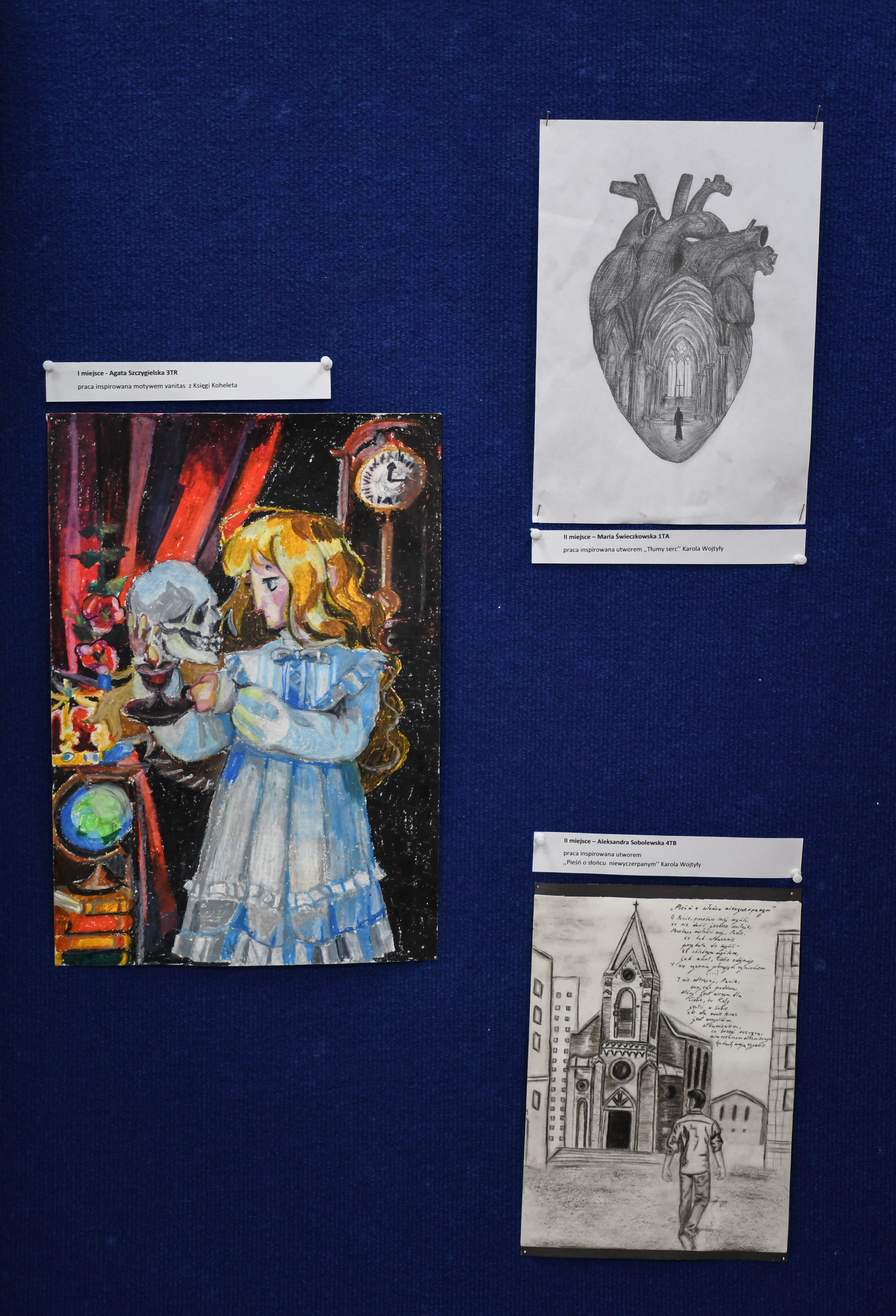 Nagrodzone prace plastyczne przyciągające uwagę bogactwem symboli i głębią przekazu. można podziwiać na szkolnym holu.